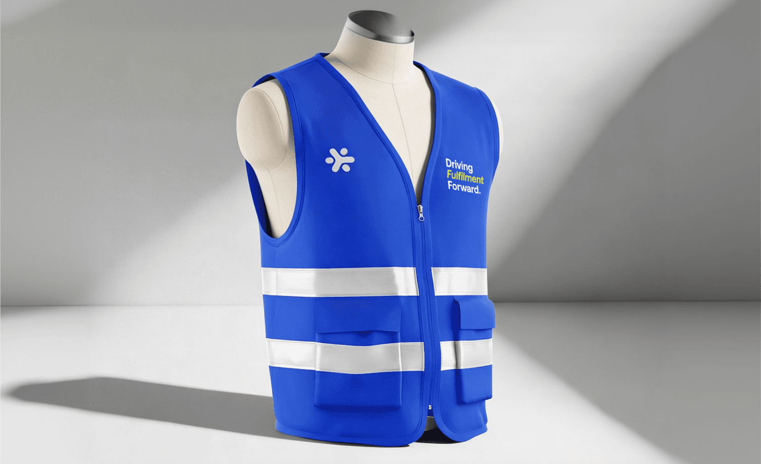 Stay visible in Helm blue, with reflective bands and front pockets for whatever you need to keep close.
